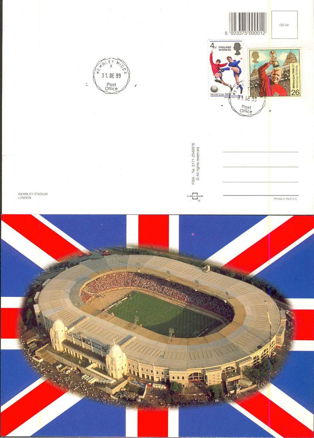1974 World Cup, MINT Set of 6 stamps issued by ROUMANIA to commemorate the German tournament - £5 1978 World Cup, MINT set of 8 stamps issued by HUNGARY for the Argentine tournament £7 SPECIAL ITEM WEMBLEY - THE END OF AN ERA, LIMITED EDITION OF ONLY 20. A strictly limited edition commemorative issue to mark the end of Wembley Football Stadium. Shown below (front of the card is shown at the bottom), the Wembley Postcard has been hand stamped to the reverse on New Year's Eve 1999 with the Wembley postmark. The back of the card (shown below in the top half) also contains an original 1966 England Winners stamp and the special Millenium Edition Bobby Moore stamp showing him with the Jules Rimet Trophy at Wembley. TWENTY ONLY PRODUCED. Cost, including postage and packing, £25 each.