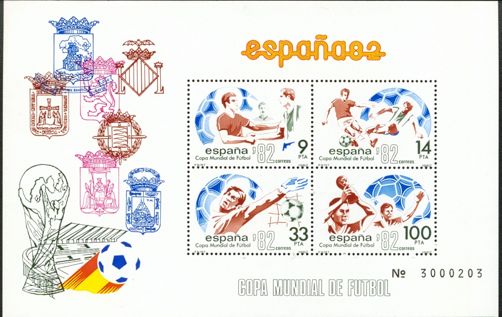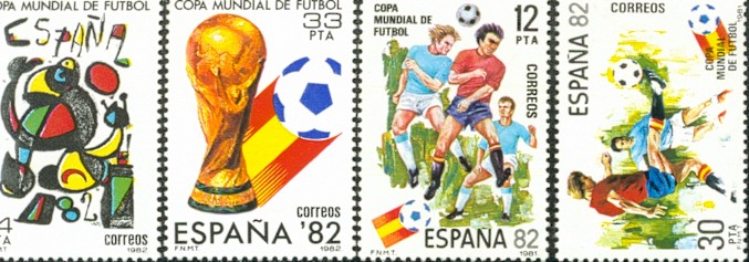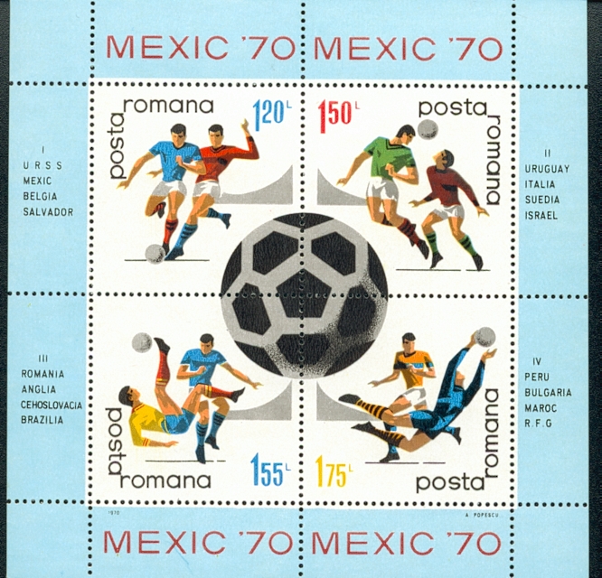 CZECHOSLOVAKIA set of 6 football stamps (SG1907-1912) issued for the tournament £5.75 EL SALVADOR set of 16 stamps (SG1328-1343) with each stamp showing a picture of each country in the tournament £15 MEXICO Set of two stamps (SG1187-8) £5.75 MEXICO set of two stamps (SG1209-10) £5.25 ROUMANIA set of 4 stamps (SG3731-3734) for the Mexico tournament £3.50 ROUMANIA Miniature Sheet (SG3735) depicting 4 different stamps and 4 different football scenes to commemorate the Mexican Tournament (shown below) £4.75 RUSSIA set of 2 stamps for the Mexico tournament (only one of which relates to football) £2.75 URUGUAY single stamp (SG1426) mint £4.50, used £2.50 1974 TOURNAMENT IN GERMANY BRAZIL miniature sheet (MS1501) £5.75 BRAZIL single stamp (SG1506) £1.75 BULGARIA miniature sheet (SG MS2319) £5 BULGARIA set of six stamps (SG2313-8) £4.75 CHILE set of 2 stamps (SG722-23) £5 HAITI (SG1298-1303) rare set of six stamps £15, POLAND miniature sheet (SG MS2315) £3 URUGUAY set of 3 air stamps (values 200, 300, 500) £7.50 URUGUAY rare set of 3 (SG1563-5) £18 URUGUAY miniature sheet (catalogue number unknown) titled 'Uruguay Pais De Tourismo' and with the 74 World Cup logo on the incorporated stamp - rare £18 WEST GERMANY set of 2 stamps issued by the hosts (SG1707-8) £2.75 OUT OF STOCK YUGOSLAVIA single stamp (SG1614) £1.20 1978 TOURNAMENT IN ARGENTINA ARGENTINA miniature sheet (700 pesos) £5 ARGENTINA miniature sheet (value 1000 pesos and overprinted 'Argentina Campeon') £8 ARGENTINA single stamp (SG1577) £1.50 ARGENTINA set of 5 stamps (SG1578-82) £4.75 ARGENTINA set of 4 stamps (SG1586-9) £4.75 BRAZIL set of three stamps (SG1704-6) £2.50 HUNGARY set of 8 stamps issued to commemorate the Argentina Tournament £5.50 HUNGARY miniatue sheet £3 MEXICO set of three stamps (SG1436-8) £7 PERU set of 4 stamps (SG1367-70) £3.75 POLAND set of 2 stamps issued to commemorate the tournament £1.50 TUNISIAN set of 2 stamps (SG904-5) £5 1982 TOURNAMENT IN SPAIN ALGERIA set of 2 stamps (SG809-10) £6 BRAZIL set of 3 stamps (SG1943-5) £7.50 BRAZIL miniature sheet (MS1946) £5 CAMEROON rare set of two (SG949-950) £15 CAMEROON rare set of 4 stamps (SG934-937) £15 CAMEROON rare miniature sheet (SG MS938) £15 CZECHOSLOVAKIA set of 3 stamps (SG2609-11) £4 OUT OF STOCK EL SALVADOR a set of two very scarce miniature sheets, one with 24 nations' flags and one with 24 nations' crests, excellent (SG1712-1759) £130 EL SALVADOR an single large stamp (SG1760) which accompanies the two scarce miniature sheets, this one depicts the El Salvador team in the centre £15 FRANCE stamp issued for the tournament £2 HONDURAS scarce miniature sheet (SG MS 1002) £10 HUNGARY set of 7 stamps (SG3186-93) £5 ITALY single stamp (SG1768) £5 KUWAIT set of two stamps (camel with a football) £5 PERU single stamp (SG1543) scarce £4 POLAND set of two stamps (SG2815-6) £3 RUSSIA single stamp (SG5234) £2 SPAIN Miniature Sheet,consisting of 4 stamps (9, 14, 33, 100Pts) surrounded by football scenes on the sheet (below). £5