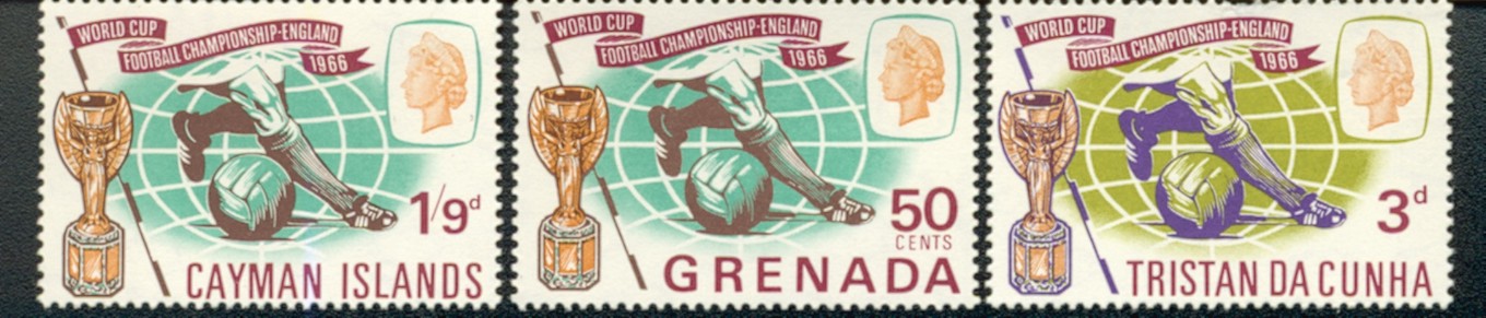 1966 World Cup, Crown Colony Set, MINT condition. Total of 40 stamps in this set, each bearing a picture of the Jules Rimet Trophy with the heading 'World Cup Football Championship - England 1966' £25. Examples of 3 out of the 40 stamps in the set shown below: